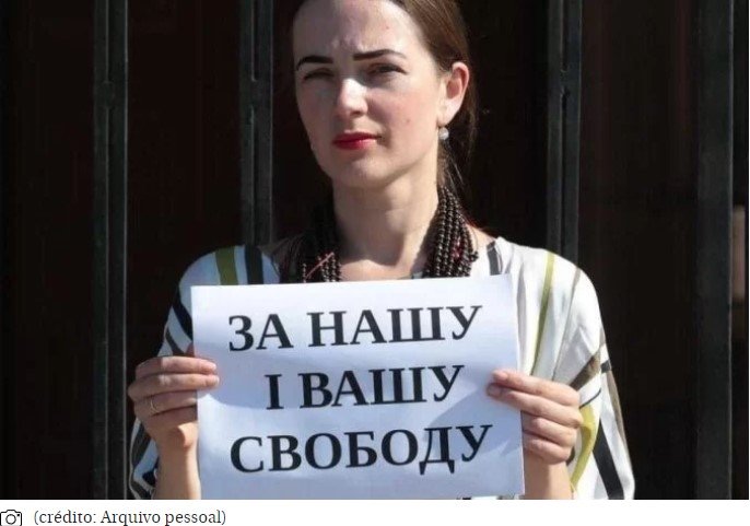 O cartaz na mão da ativista de direitos humanos ucraniana Oleksandra Vyacheslavivna Matviichuk, 39 anos, traz um antigo slogan usado por dissidentes soviéticos que ela transformou em luta: “Pela nossa e por vossa liberdade”.