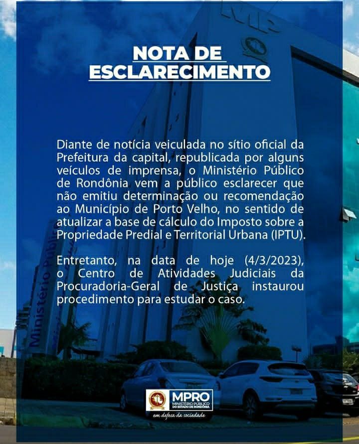 Por meio de nota enviada a imprensa no início da noite de sábado (4), o Ministério Público de Rondônia esclarece que não determinou ou recomendou ao Município de Porto Velho, que atualizasse a base de cálculo do Imposto sobre a Propriedade Predial e Territorial Urbana (IPTU). Disse ainda que na mesma data (4), instaurou um procedimento para estudar o caso.