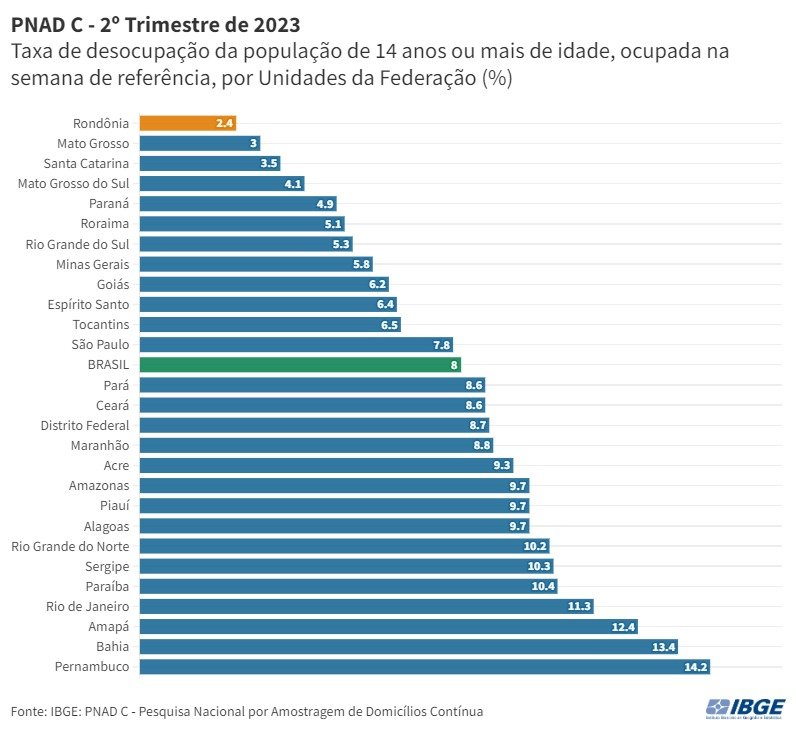 A PNAD Contínua, divulgada pelo IBGE, mostrou que Rondônia permaneceu com a menor taxa de desocupação do país no segundo trimestre de 2023. De acordo com a pesquisa, 2,4% da força de trabalho estavam desocupadas no período. O índice é menor que o registrado no trimestre anterior (3,2%) e no segundo trimestre de 2022 (5,8%).Mas, apesar do baixo número de desocupados, 48,8% dos trabalhadores rondonienses não possuíam registros em carteira de trabalho ou CNPJ. O grupo de trabalhadores por conta própria apresentou a maior taxa de informalidade em Rondônia: 89,7% destes trabalhadores não têm CNPJ. O índice também é alto entre os trabalhadores domésticos: 73,2% não têm registro em carteira.
