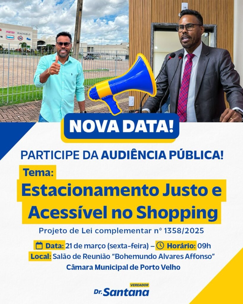 O vereador Dr Santana convida toda a população para participar da audiência pública que discutirá o Projeto de Lei Complementar nº 1358, de autoria do vereador Dr. Santana. A sessão será realizada no dia 21 de março, às 9h, no Salão de Reuniões ― Bohemundo Álvares Affonso da Câmara Municipal de Porto Velho, e será uma oportunidade para que cidadãos, comerciantes e representantes da sociedade civil expressem suas opiniões e contribuam para o aprimoramento da proposta.
