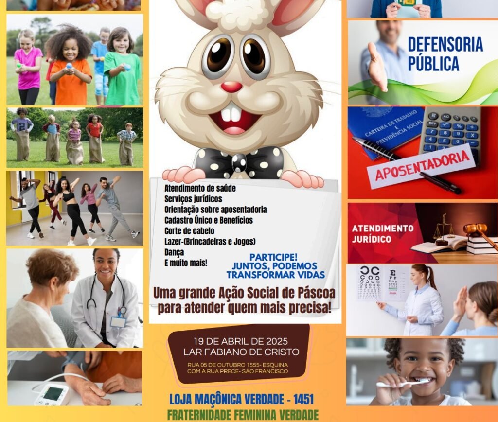 Neste sábado, dia 12 de abril, das oito da manhã à uma da tarde, a Zona Leste de Porto Velho será palco de uma grande mobilização de amor ao próximo. A Loja Maçônica Verdade, em parceria com a Fraternidade Feminina Verdade e com o apoio do Grande Oriente do Brasil – Rondônia, realiza uma grandiosa Ação Solidária de Páscoa, no Centro Espírita Lar Fabiano de Cristo.