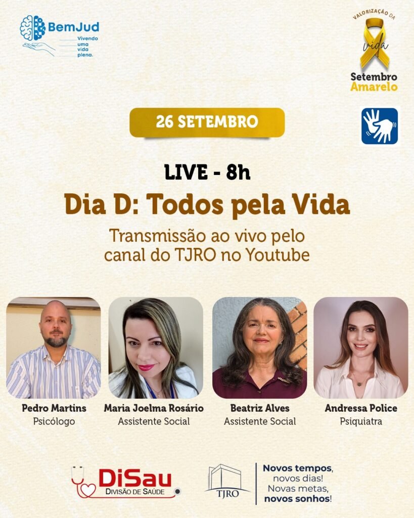 Em continuidade à campanha do Setembro Amarelo, mês voltado à promoção da saúde mental e valorização da vida, a Divisão de Saúde (Disau) do Tribunal de Justiça de Rondônia promove nesta sexta-feira, 26 de setembro, a live “Dia D: Todos pela Vida”. A transmissão ao vivo será pelo canal oficial do TJRO no Youtube, das 8 às 9h da manhã, aberta ao público geral e com acessibilidade em Libras.