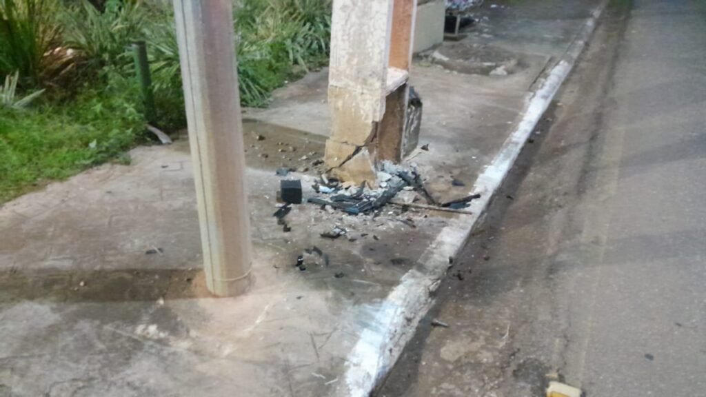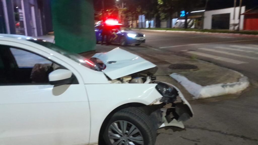 Um carro desgovernado saiu da pista e atingiu um poste. Com a violência do impacto, o veículo ficou com a frente destruída e o poste teve a sua estrutura comprometida. O impacto foi tão forte que os airbag foram acionados.
