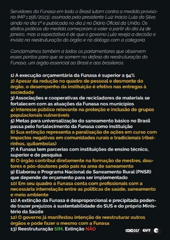Entre as agendas, os representantes do Sindsef-RO participaram das mobilizações contra a Medida Provisória (MP 1.156) que trata da extinção da Funasa com a campanha “Reestruturação sim, extinção não”, com panfletagem aos deputados federais e senadores. O diretor-geral da Condsef, Sérgio Ronaldo confirmou a participação de audiência com a presidente da Funasa que ocorrerá também durante a semana.