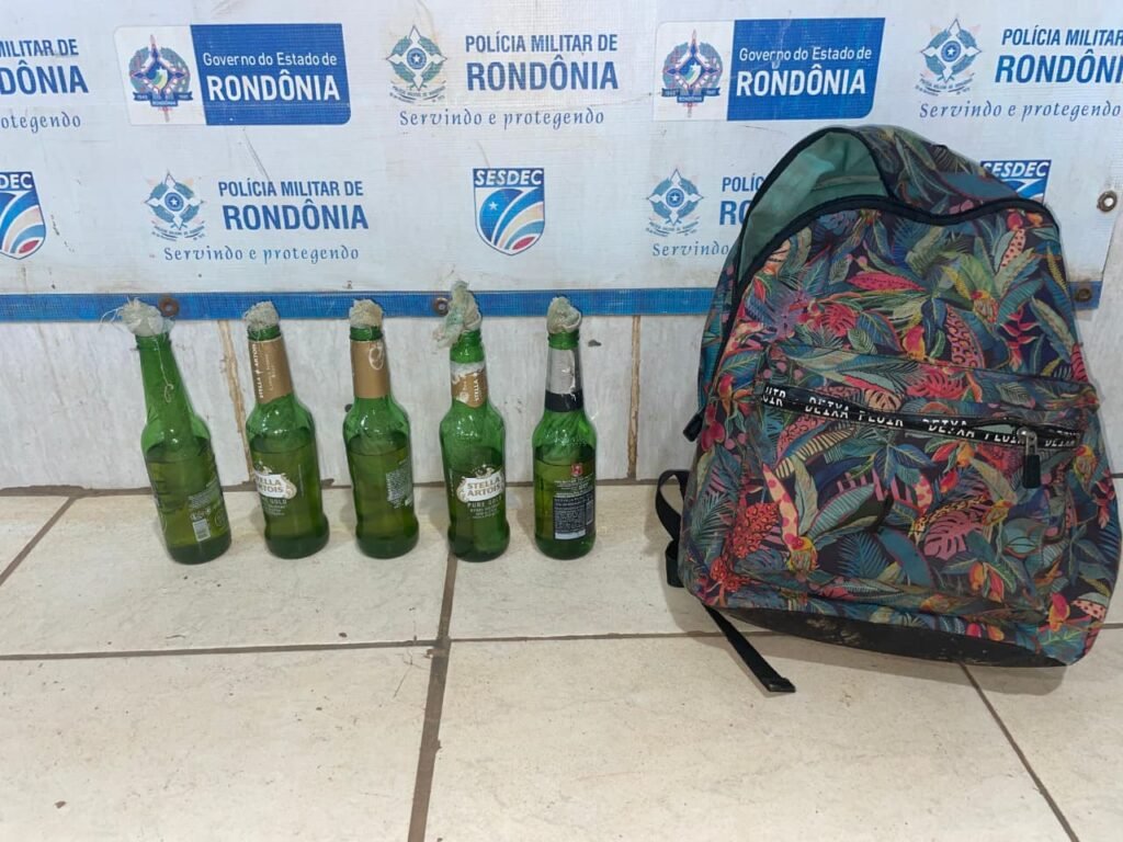 Ao chegar ao local, os policiais encontraram o menor de 15 anos de idade, contido por populares. Com ele, foi localizada uma mochila contendo cinco garrafas de coquetel molotov, artefatos incendiários de fabricação caseira compostos por garrafas de vidro com líquido inflamável (gasolina) e pavio improvisado com estopa.